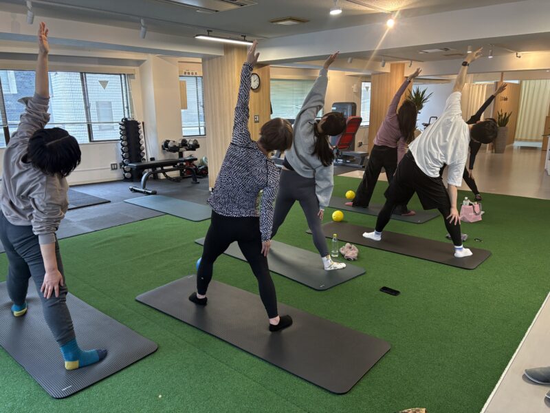 スクワットやランジなどヨガのポーズや、ピラティスの呼吸に合わせた体幹トレーニングを行います。